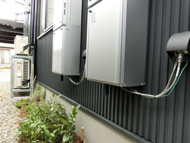 ガス式給湯器の配管は基礎ではなく背面の壁を貫通させていると思われる。