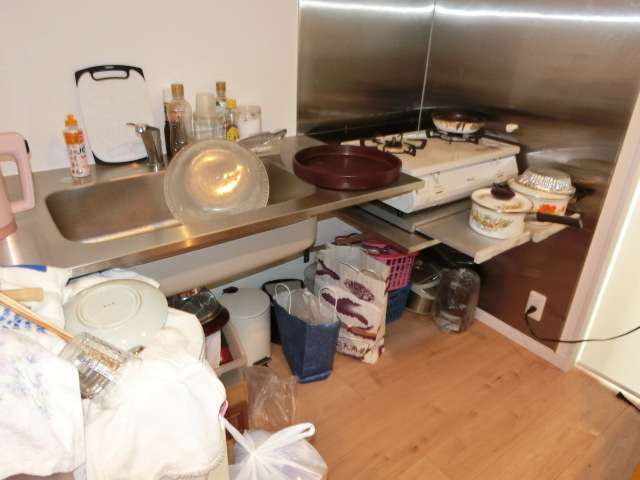 キッチン台にこぼれた水が下(床)に落ちる。キッチンを選ぶ際に「水が下に垂れない」機能にすれば良かった(談)