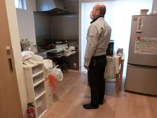 現状を確認。クロスの召し合わせ部位は「隙間が開く・クロスが動く」ことを前提に施工されており、新築後の2年間は大きく変化する時期となる。次回の2年目点検で改めて目視検査することを説明。ご主人がシーリング関連にお勤めされているからかコークボンド(水性)の存在を知っておられた。