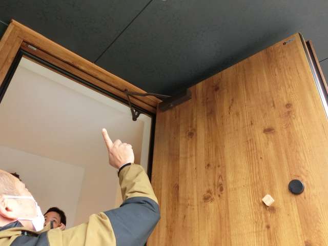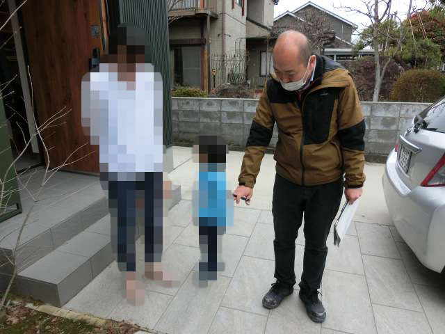 点検総括・・・窓のクレセントの不具合(LDK)の現状を確認。タイル目地のヒビ割れ(玄関アプローチ)、玄関屋根軒裏の模様、板張り用塗料の提案に関しては後日対応となった。室内が過乾燥気味のお宅で、加湿器を日常的に点けることで湿度50%をキープしているようであった。健康にはよいとは言えないが、洗濯物が乾きやすい室内環境でもある。洗面脱衣室以外にも各居室にも洗濯物を干す器具が取り付けられていることで「平屋」という限られた空間を有効活用しているようであった。