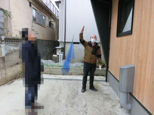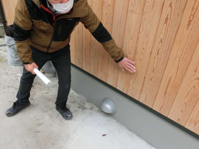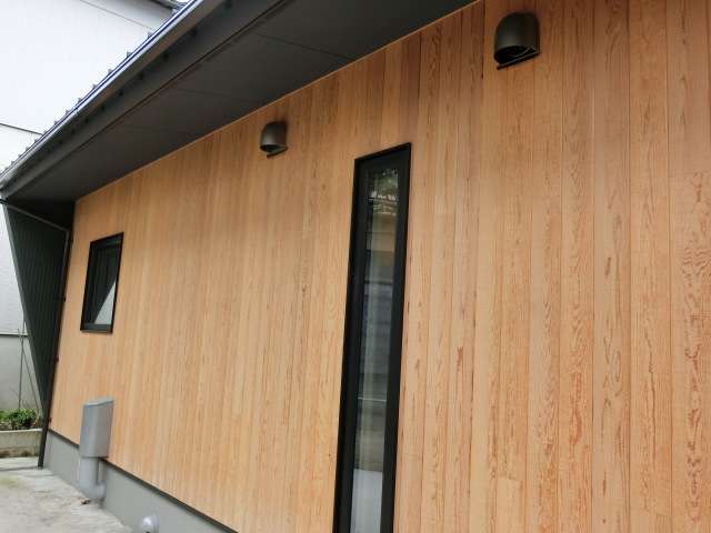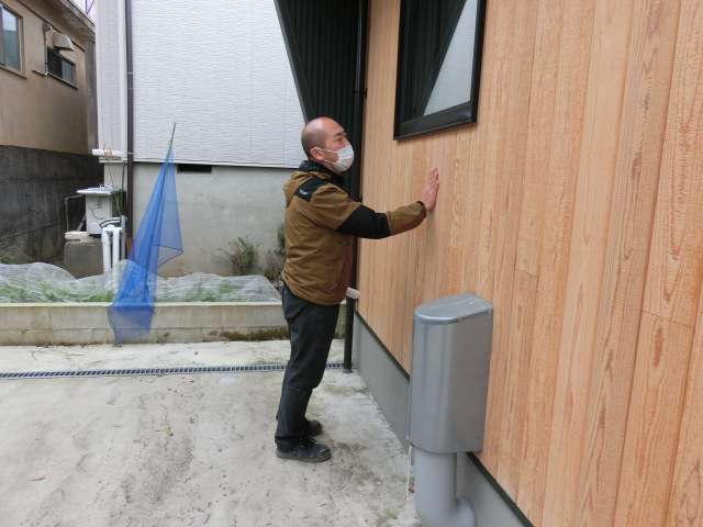 東側の板張りの外壁材は約1年が経過して下の方が太陽光の紫外線などの影響で少し色あせている状態。業者へ塗装依頼すると約20万円かかることを口頭で説明。