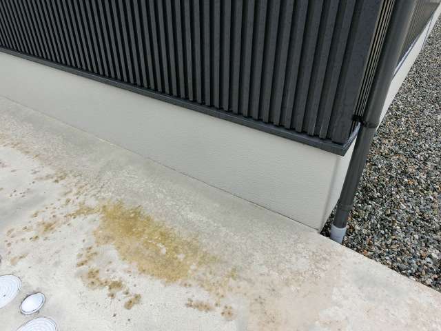 基礎表面に付着している赤錆を再確認。前回の1年目点検でも見受けられており、赤錆の範囲は変化していないと思われる。砂利による「もらい錆」と説明している。