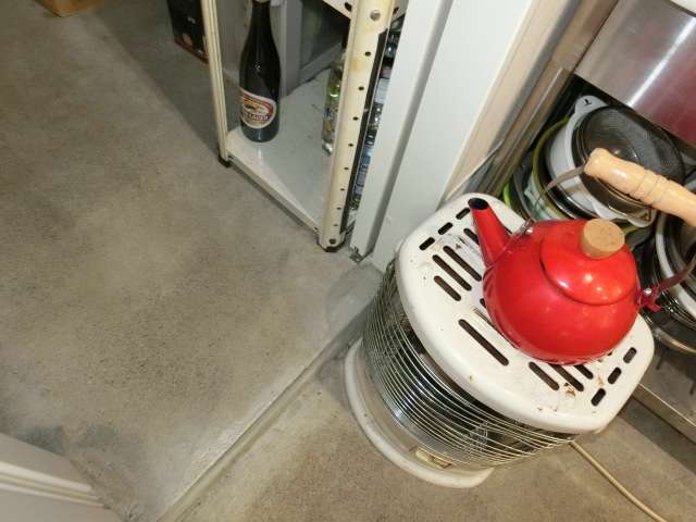 現状を確認。土間コンクリートに打ち込まれている、吊り戸の開閉の際の振り止めビス。「木」と異なり打ち込んだビスの抵抗が少ないことで外れてしまうデメリットがある。対処することとなった。