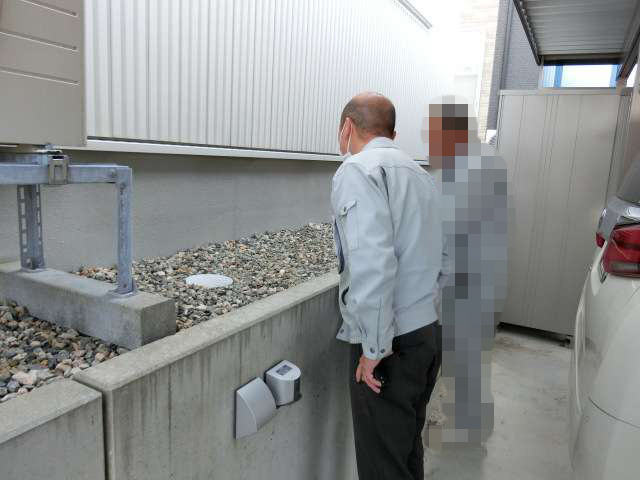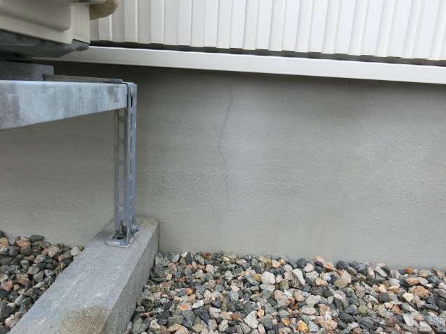基礎化粧モルタルのヒビ割れ補修跡を確認。前回の1年目点検でも対処しているが、お客様からの指摘や新たなヒビ割れが発見された為、改めて対応することとなった。