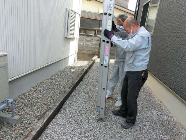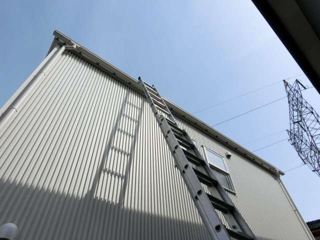 西側の敷地が狭かった為、隣家の敷地にハシゴを掛ける許可を得た。