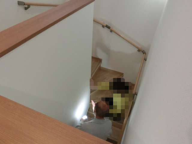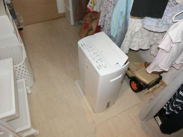 2階の敷布団と床の間がベチャベチャになるので床の上にシートを敷いているそう。一般的に結露の主な原因は室内干しにより衣類から放出された水分。お客様宅では除湿器で乾かしているが大量の洗濯物の水分を全て除湿するのは難しいと思われる。たまった湿気が物干し場の扉の開閉の都度、階段口から上昇し結露化しているのかもしれない。