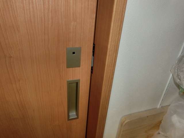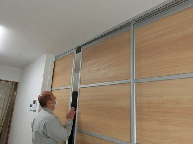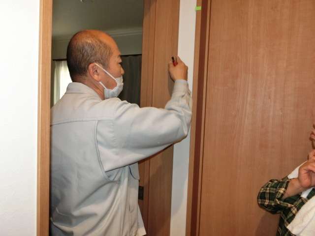 扉の上下の枠材が湿度変化等によって少し伸縮することで起こり得る現象であり、扉の高さを補正することで改善することを説明。対処することとなった。