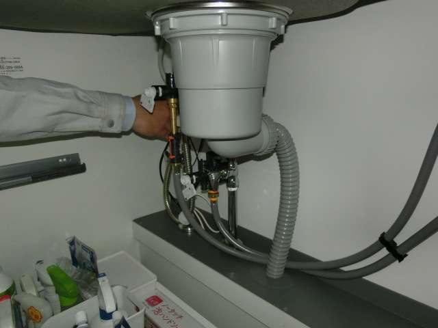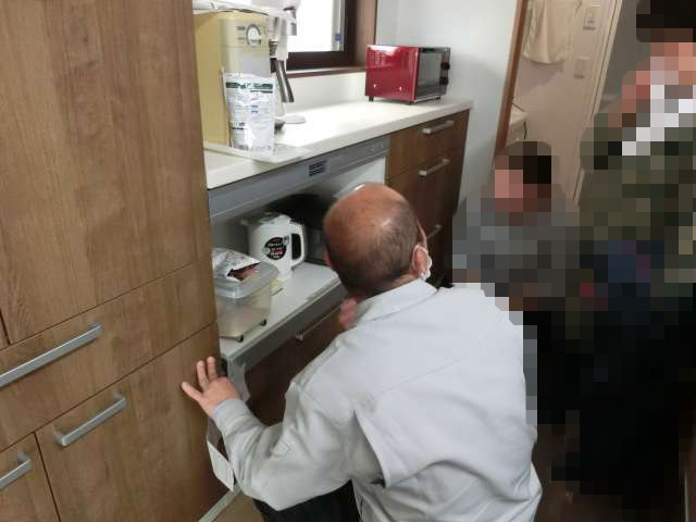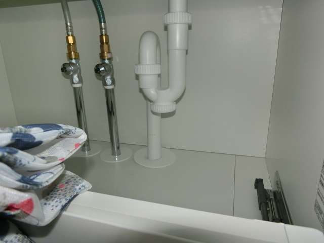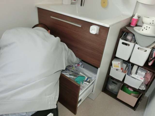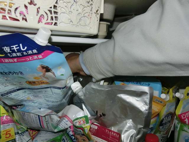 給排水管からの水漏れの有無を確認。収納の陰になることで給排水管からの水漏れは発見しにくい為、「水漏れ事例」を知ること、確認する習慣を促した。