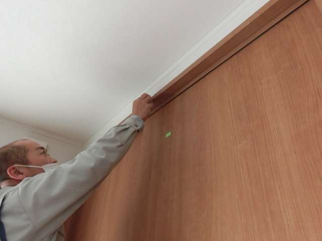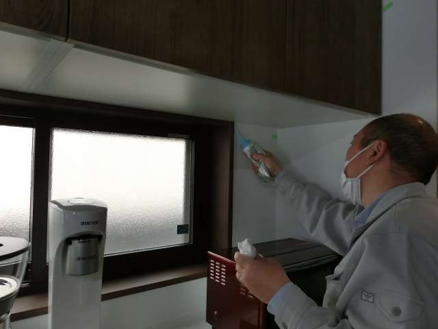 現状を確認。オブラート状の白い汚れはクロスの糊が完全に乾いて浮き出てきたものであることを説明。水拭きすると糊が伸びるだけで再発する為、乾拭きで擦り落として頂くよう助言。実際に白い汚れ(クロスの糊)が手で擦って落ちる様子をお客様にも見て頂いた。