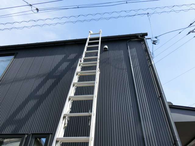 屋根点検を実施。屋根材はガルバリウム鋼板仕様。大屋根には太陽光パネルが搭載されている。
