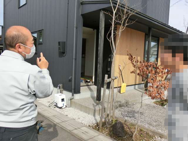 向かいの家の横の電柱付近は液状化現象が発生し砂が噴出しているところもあったようだが、こちら側のでんちゅうには液状化現象はなく、土間コンクリートのヒビ割れが少し発生た程度であった。工事開始前の地盤調査等では「前面道路を境にして地盤の固さの違い」があったことを説明。