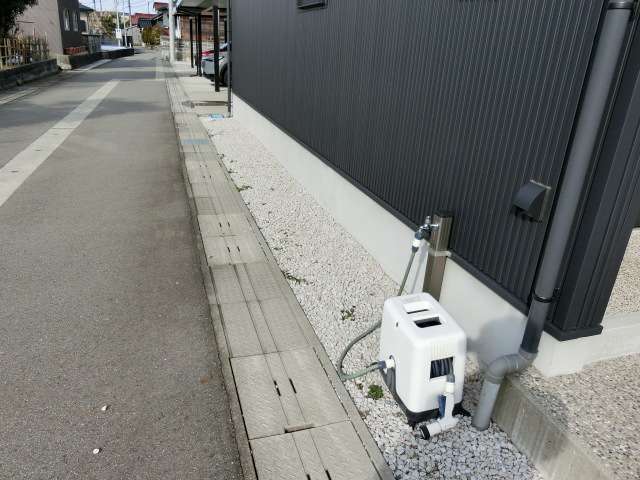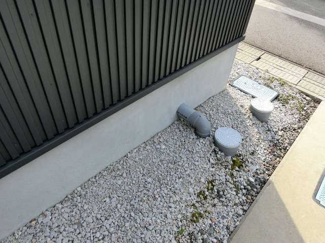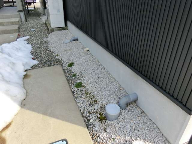 配管が露出している状態を確認。将来的な劣化(太陽の紫外線などの影響)を考えると、北側で太陽光が当たりにくい場所ではあるが、地中に埋めるなど何らかの処置が必要と思われる。